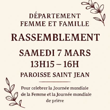 Le Département Femme et Famille organise un rassemblement spécial le samedi 7 mars, de 13h15 à 16h, à la paroisse Saint Jean. Cet événement a pour objectif de célébrer ensemble la Journée mondiale de la Femme ainsi que la Journée mondiale de prière.