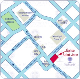 L’église de St Jean se situe à l’angle de la rue de la Poudrière et de la rue Maillard tout près du jardin de la compagnie à Port Louis.
